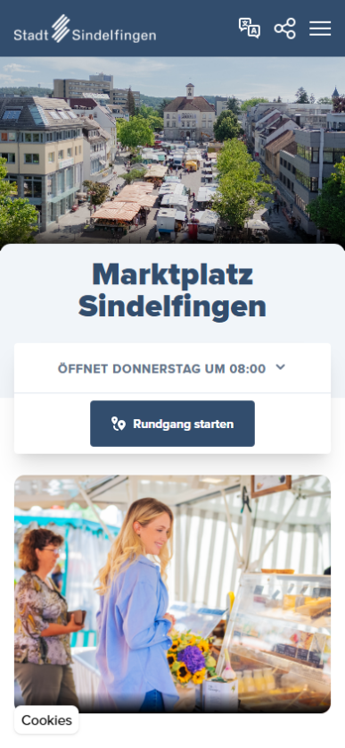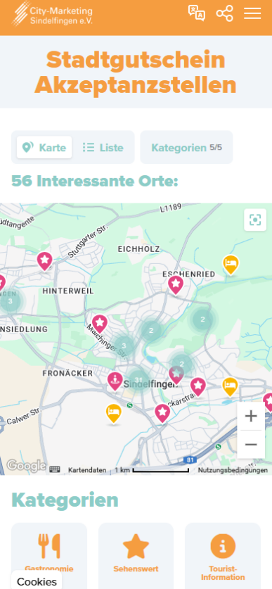 Auf Guide Ebene können Backend-Nutzer nun auf den zusätzlichen Reiter „Design“ zugreifen. Hier können sowohl die Schriftart als auch Farben und Logos angepasst werden. So können unterschiedliche CIs berücksichtigt werden. Ein Beispiel zeigt die Stadt Sindelfingen mit Guides zu: Gastronomie, Wochenmärkten, Übernachtungsmöglichkeiten und Stadtgutschein Akzeptanzstellen.