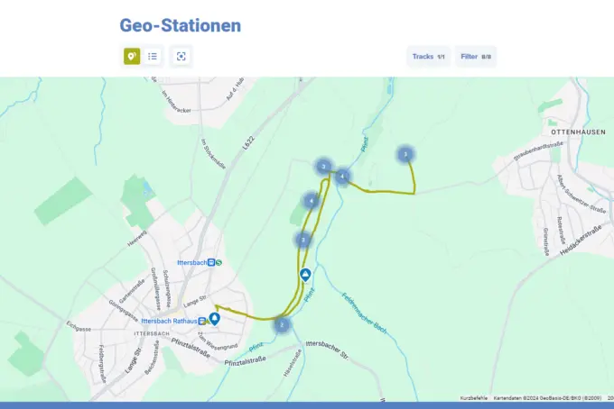 Im Frontend sind die Strecken automatisch auf der Karte aktiviert und können vom Nutzer per Filterauswahl ein- oder ausgeblendet werden. Um eine Unterscheidung von sich überlappenden Routen zu ermöglichen, werden die jeweiligen Wegstrecken automatisch in unterschiedlichen Farben angezeigt.
