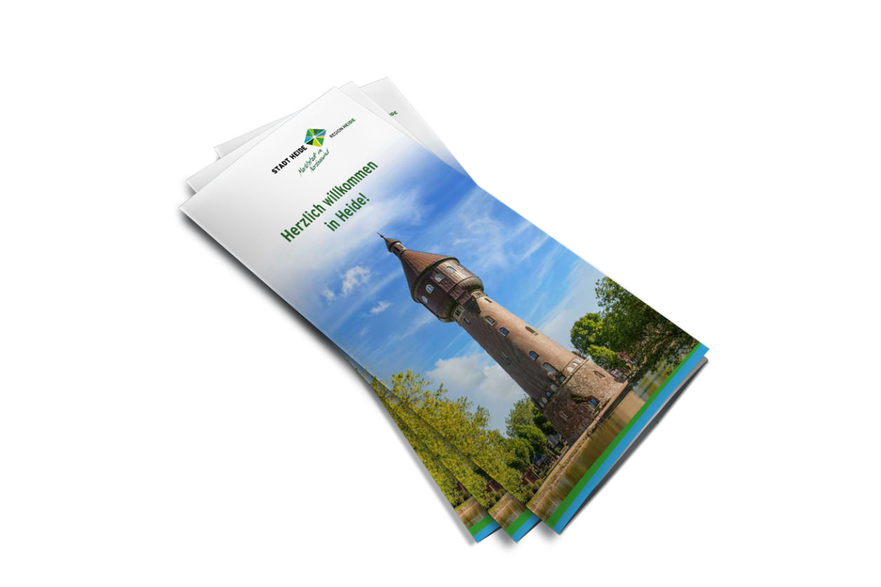 Weiterhin wurde eine neue Broschüre in der CI von Heide entwickelt, mit der Besucher den Rundweg erkunden können. Die Broschüre besteht aus einer Übersichtskarte mit allen wichtigen Punkten in der Stadt und einem Informationsteil, der die einzelnen Stationen in kürze erklärt. Zusätzlich wurde ein Aufkleber-Set in zwei Größen entwickelt. Die Aufkleber werden u.a. an den öffentlichen Parkscheinautomaten, Geldautomaten, der lokalen Gastronomie und bei Geschäften verteilt. Durch eine Vielzahl von Berührungspunkten im gesamten Stadtgebiet sorgt der Rundgang auch offline für Aufsehen und lädt Einheimische und Besucher gleichermaßen dazu ein die Stadt Heide bei einem gemütlichen Spaziergang näher kennenzulernen.