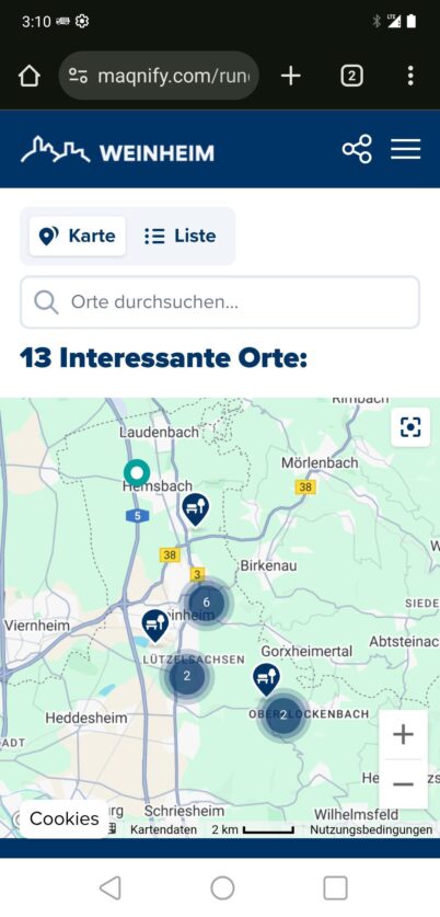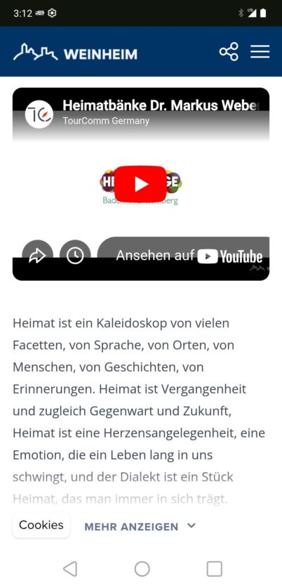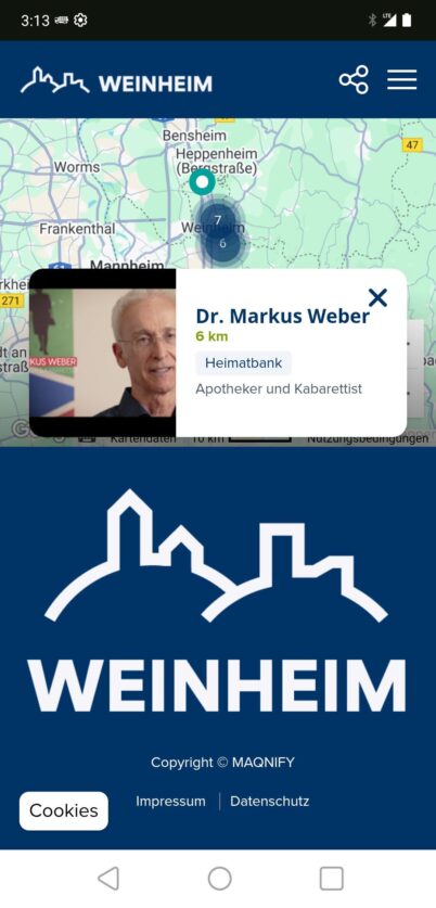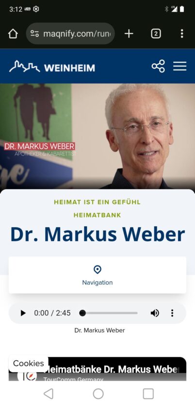 Im Rahmen der Heimattage Baden-Württemberg 2025 in Weinheim entwickelte TourComm ein Konzept, um ausgewählte Bänke im Stadtgebiet „sprechen“ zu lassen. Plattform für die audiovisuelle Präsentation sollte dabei der MAQNIFY© Guide sein. Ziel war es kurzfristig unter dem Motto „Heimat ist ein Gefühl“ ein digitales Erlebnis zu schaffen. TourComm übernahm gemeinsam mit Videograph Björn Aßmus von TwentyOneFilm das Sponsoring für das Projekt.