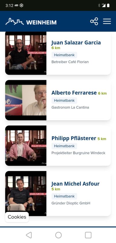 Grundlage für die insgesamt 13 Stationen im Stadtgebiet von Weinheim über Sulzbach, Lützelsachsen, Ritschweier, Oberflockenbach, Rippenweiher und Hohensachsen, bildeten Interviews mit von der Stadt ausgewählten „Gesichtern“ aus Weinheim. Auf diese Weise entstanden im ersten Halbjahr 2025 kurzweilige Video-Interviews. Die Teilnehmer sollten erläutern, was Heimat für sie bedeutet, was sie mit der Stadt verbindet und welches ihre jeweiligen Lieblingsorte sind.